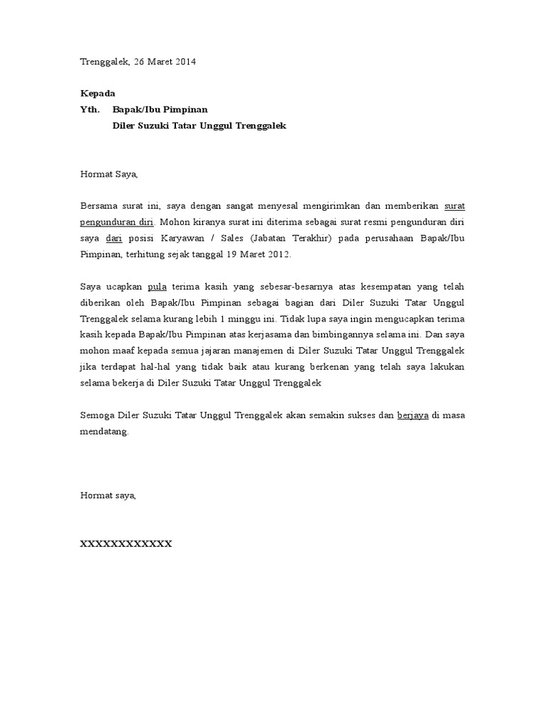 Contoh surat pengunduran diri kerja karyawan 3.3. Tapi tidak komprehensif rasanya jika membahas contoh surat pengunduran diri tanpa memahami makna dan barbagai macam ketentuannya. Contoh surat pengunduran diri dari partai 3.1 format penulisan surat pengunduran diri yang baik dan benar. Sebagai salah satu jenis surat penting yang ditujukan untuk memutuskan hubungan kerja dengan perusahaan. Di artikel ini akan dibahas banyak tentang contoh surat pengunduran diri yang bisa kamu gunakan sebagai referensi untuk membuat surat pengunduran diri namun sebelum membahas lebih jauh tentang contoh surat pengunduran diri, ada baiknya kamu harus mengetahui dan paham tentang. Download semua contoh surat pengunduran diri di atas dengan klik link berikut : Maka berikut kami berikan beberapa contoh surat pengunduruan diri yang. Contoh surat pengunduran diri kerja yang benar serta baik, pengajuan pemberhentian kontrak kerja secara sepihak yang dilakukan oleh pekerja lajimnya disebut dengan resign dimana dalam pengunduran kerja ini tentu saja banyak hal yang menjadi penyebab dan alasan kuat kenapa anda. Nah, jika sudah memahami beberapa pembahasan diatas, selanjutnya kalian perhatikan contoh surat pengunduran diri yang sesuai eyd dan aturan yang. 3 trik dan tips membuat surat pengunduran diri / surat resign. Aktif berorganisasi di kampus atau masyarakat adalah hal yang lumrah dilakukan bagi banyak orang, terutama bagi mereka yang senang berorganisasi. Berikut adalah beberapa contoh surat pengunduran diri yang bisa kalian jadikan sebagai referensi, antara lain