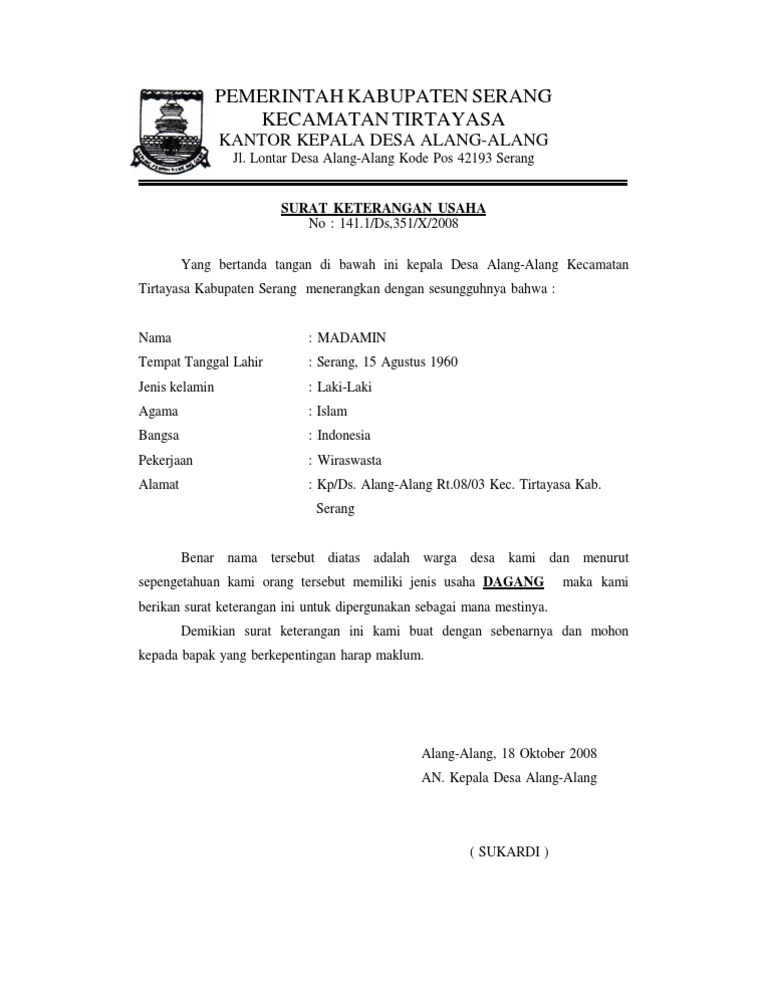 Surat keterangan usaha adalah surat keterangan yang dikeluarkan oleh lembaga pemerintah yang menerangkan keberadaan usaha kita. Surat keterangan usaha ini biasanya diperlukan ketika seorang. Berikut cara buat nomor induk berusaha (nib) secara online. Contoh surat keterangan usaha bisa kamu dapatkan di sini secara lengkap. Surat kuasa apabila pemilik usaha menunjuk orang lain untuk mengurus sku. Apakah surat keterangan usaha ( sku ) tersebut ? Surat keterangan domisili usaha merupakan surat resmi yang dikeluarkan oleh kelurahan dan/atau kecamatan terdekat yang menjelaskan bahwa di lokasi tersebut benar ada usaha yang dijalankan. Selain menjadi bukti bahwa usaha anda telah diakui pemerintah setempat, surat ini. Contoh surat domisili dari rt. Surat keterangan usaha dibutuhkan oleh pengusaha untuk mengubah tarif listrik yang awalnya rumahan menjadi bisnis. Surat keterangan usaha adalah dokumen yang menunjukkan bahwa seseorang memiliki usaha yang legal. Dan apasaja fungsi atau kegunaan dari surat tersebut ? Surat keterangan usaha ( sku ) adalah surat resmi yang dikeluarkan oleh pemerintah.